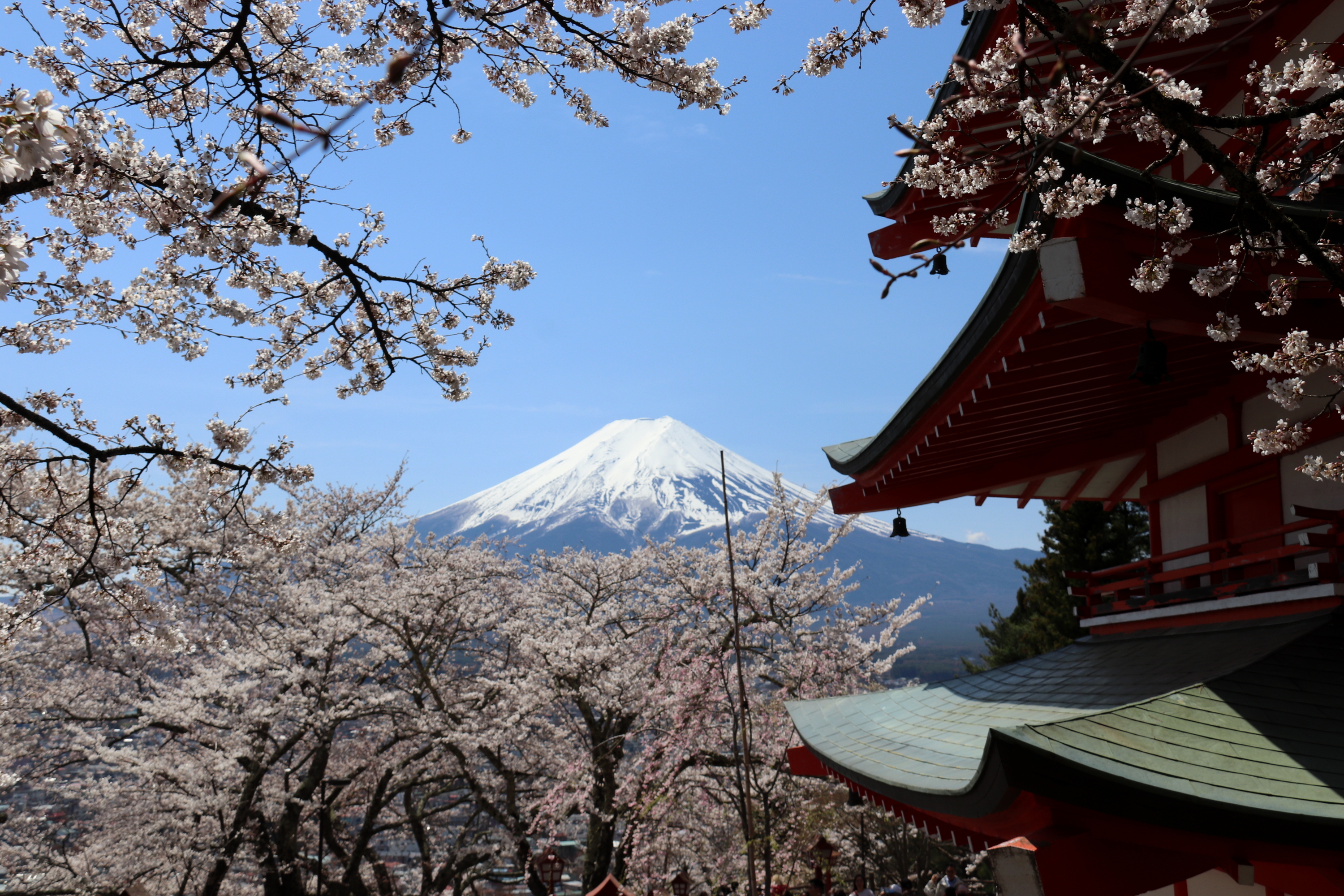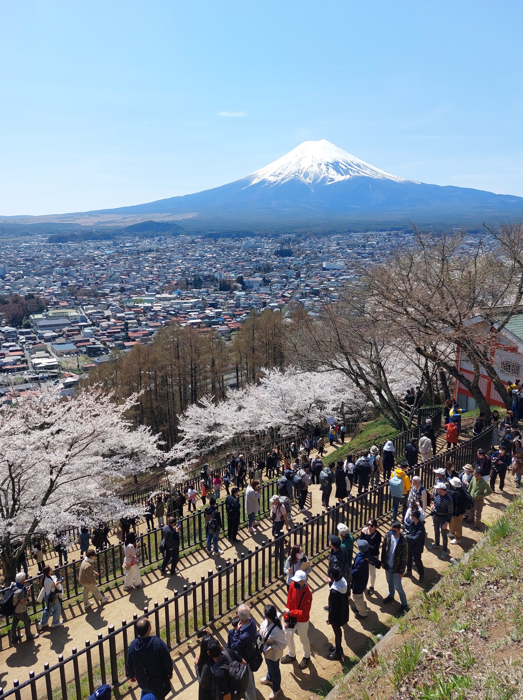 While I enjoyed my time there, I probably wouldn’t return. I was lucky it was a clear day so I got another view of Mt. Fuji – but it paled compared to how I was able to view the mountain on my day trip to Fuji Five Lakes. Fuji Five Lakes is a region consisting of five lakes (duuh!), but most people (incl. myself) that talk about going there, actually only visit one of them (Kawaguchi). Again, it can be reached by public transport – however, I was surprised to find the first train of the day fully booked when I showed up at the train station! I am still unsure whether I could have boarded the train without a seat reservation, as this is generally possible on most trains in Japan. However, as this was one of my first days in Japan and I just got told „fully booked“ by the agent at the counter, I waited for the next train. Unfortunately, that meant arriving late and there being lots of people at my first stop already, the famous Arakura Fuji Sengen Shrine. One of the most famous photo spots in cherry blossom season, I maybe shouldn’t have been so surprised… Was it worth it? Hell yeah. The views of Mt. Fuji on that day were stunning!