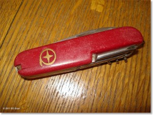 Aus reiner Gewohnheit nehme ich dieses Taschenmesser auf jede Reise mit. Man sieht, dass das Plastik schön langsam spröde wird – irgendwann wird also Ersatz fällig. Aber: Brauche ich überhaupt Ersatz!? Bisher ist das Messer noch auf keiner Reise zum Einsatz gekommen. Schön langsam für mich also ehrlich gesagt eher SCHNICKSCHNACK. Und das, obwohl jeder damit zu reisen scheint.